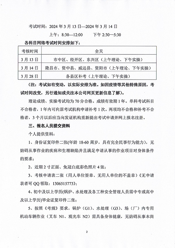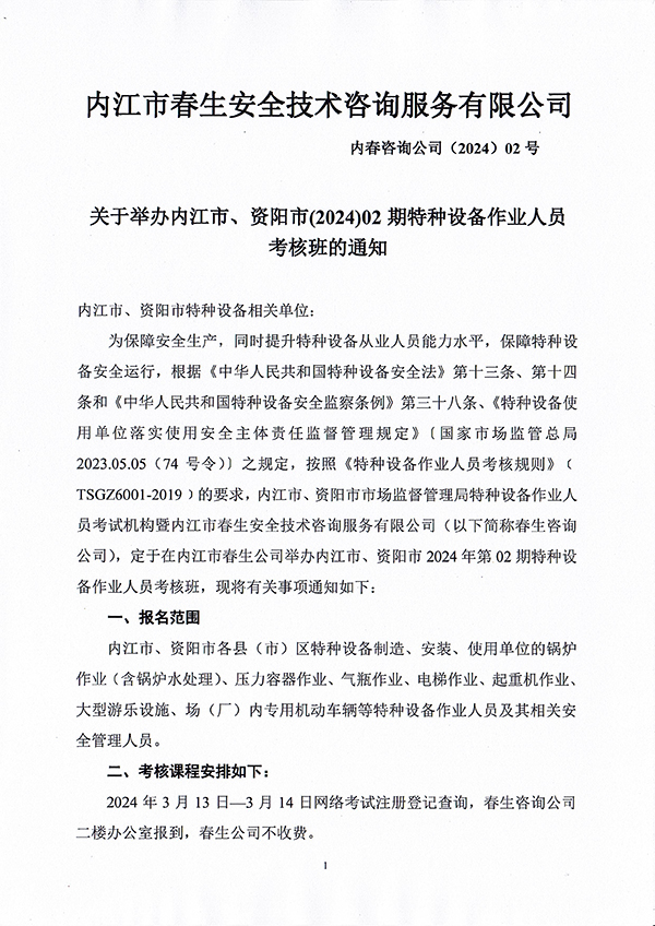 關于舉辦內江市、資陽市(2024)02期特種設備作業(yè)人員考核班的通